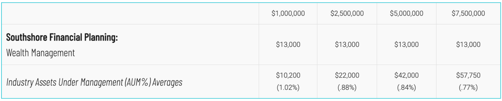 At Southshore, we believe flat pricing is often better because of its fairness and transparency. In our opinion, it shouldn’t cost you almost three times as much for the management of a $1,000,000 versus a $3,000,000 portfolio. Here is an example of how our costs could compare.